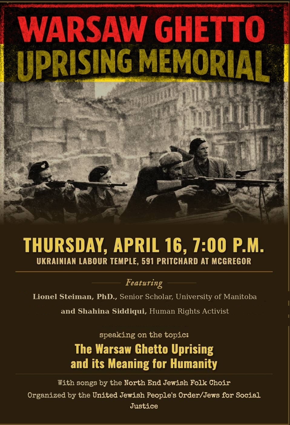 This year’s event, The Warsaw Ghetto Uprising and its Meaning for Humanity will be addressed by Dr. Lionel Steiman and Shahina Siddiqui, with a choral presentation by the North End Jewish Folk Choir.